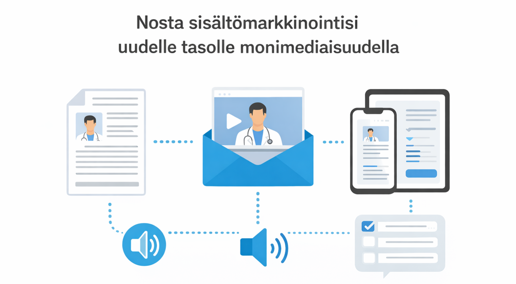 Kun kohderyhmä on vaativa, kuten suomalaiset lääkärit, sisällön täytyy olla uskottavaa, tiivistä ja aidosti hyödyllistä. Monimediaisuus auttaa tuomaan ydinviestin lähemmäs arkea ja parantamaan tavoittavuutta.